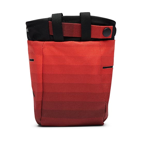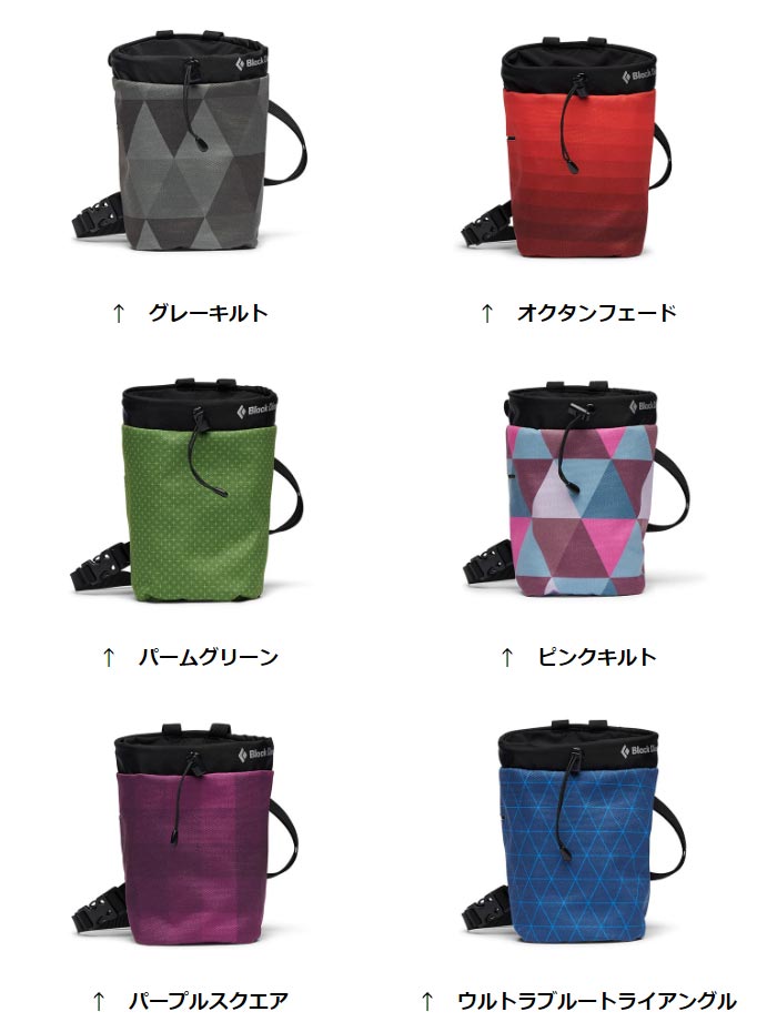 ジムでの使い勝手を追求したユニークなチョークバッグ。後方にスナップボタンを備え、ハーネスに直接クリップ可能(岩場向けにナイロンベルトも付属)。チョークボールを入れるメッシュポケットを内蔵。