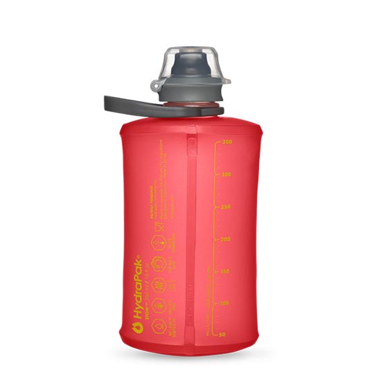 ハイドラパックのポータブル ポケットサイズ ハイドレーション。とても軽量で耐久性にも優れ、パッキングするのにミニマルなデザインの水筒です。スピルプルーフノズルは、こぼれにくく行動中でも簡単に飲むことができます。キャップ径は28mmで多くの浄水器メーカーが採用しており汎用性が高い。ハンドル付なので持ち運びに、水を入れる時にも便利です。またこのハンドルを利用して使用後は非常にコンパクトに収納することができます。2021年より飲み口を清潔に保てるフリップトップキャップが付きました。1Lには内側に仕切りを付けることで水を入れても膨らみすぎないので持ちやすい工夫が施されています。