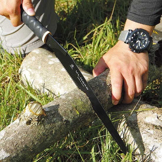 超軽量ですが、刃渡りが240mmなので太い薪でも切ることができます。一般的なノコギリよりも刃の角度をつけてあるので力が入りやすく、目線より高い木でも楽に作業できます。